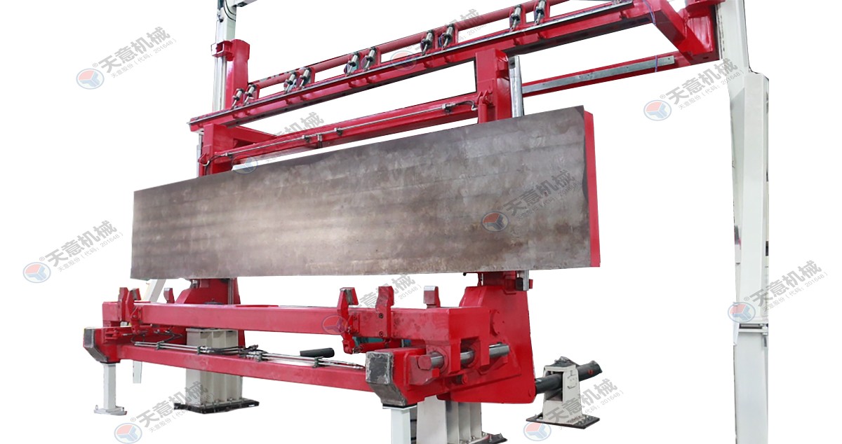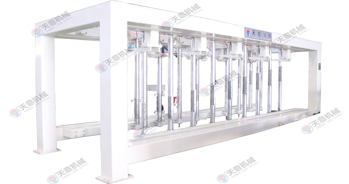 翻轉(zhuǎn)吊機(jī):抓取模箱翻轉(zhuǎn)90°,側(cè)立在切割小車上進(jìn)行切割;切割工段空翻脫模機(jī)將??蚍D(zhuǎn)90°,放在切割小車支座上進(jìn)行脫模,脫模后的??蚺c清理后的側(cè)模板進(jìn)行合模,合膜后的空??虮坏踹\(yùn)至模具回程軌道上進(jìn)行涂油處...