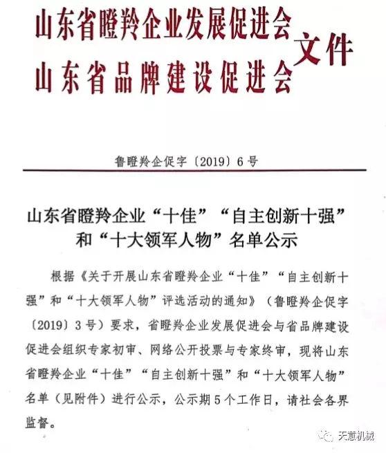 根據(jù)《關(guān)于開展山東省瞪羚企業(yè)“十佳”“自主創(chuàng)新十強(qiáng)”和“十大領(lǐng)軍人物”評(píng)選活動(dòng)的通知》(魯?shù)闪缙蟠僮帧?/span>2019〕3號(hào))要求,2019年12月6日,山東省瞪羚企業(yè)發(fā)展促進(jìn)會(huì)、山東省品牌建設(shè)促進(jìn)會(huì)發(fā)布魯?shù)闪缙蟠僮?/span>[2019]6號(hào)文,公布經(jīng)過專家初審、網(wǎng)絡(luò)公開投票與專家終審,評(píng)選出了山東省瞪羚企業(yè)“十佳”、“自主創(chuàng)新十強(qiáng)”和“十大領(lǐng)軍人物”。天意機(jī)械榮獲“山東省十佳瞪羚企業(yè)”稱號(hào)。